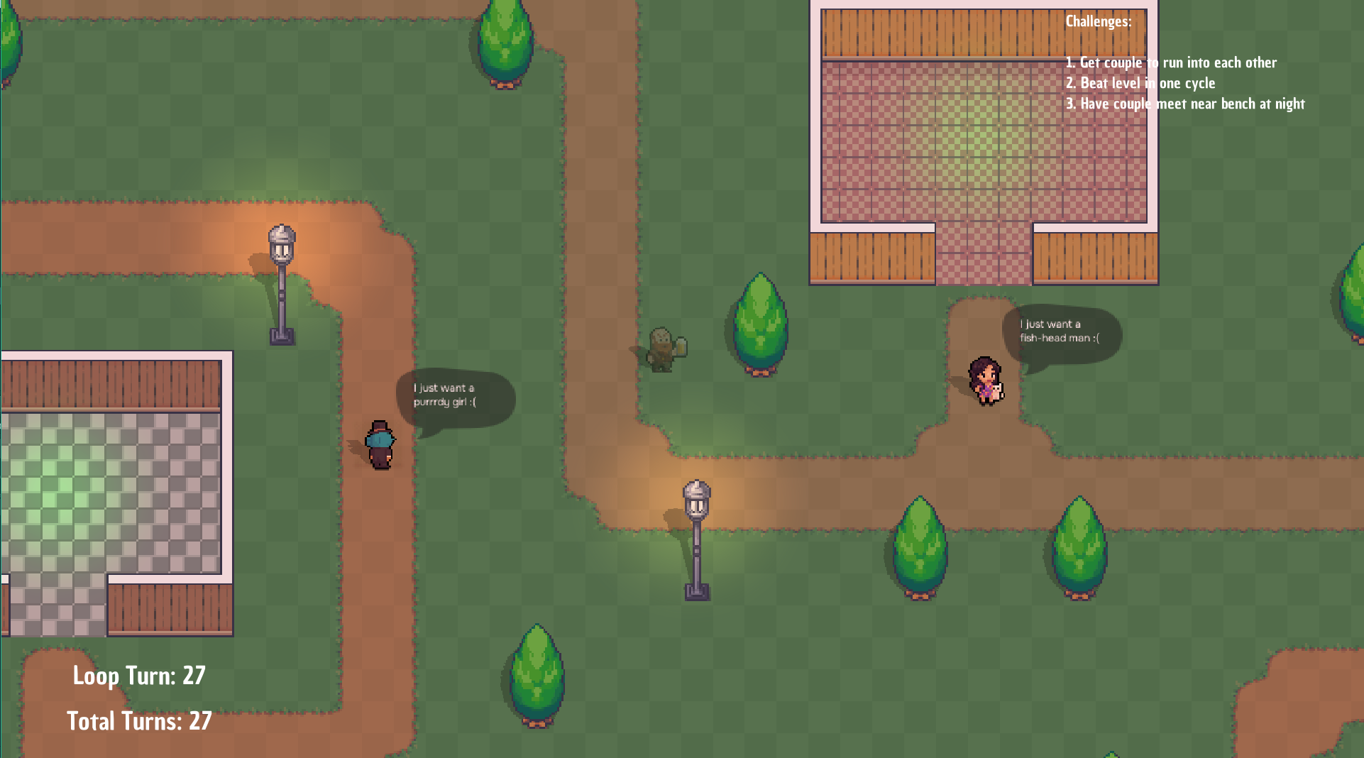 Play as a grumpy, dead, drunk-guy who is fed up with listening to everyone's problems. Since everyone seems to *loop* through the same motions every day without ever changing their routines, it's up to you to make the change for them! Use your ghost powers to possess characters allowing you to move them at your will. Solve optional objectives for increased challenge in three unique levels!
