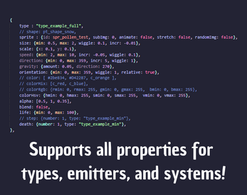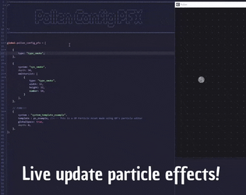 - A simple 'JSON' format based on Vinyl's Config JSON for defining particles that can be live-reloaded