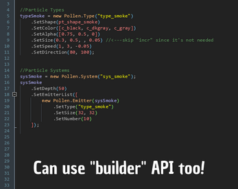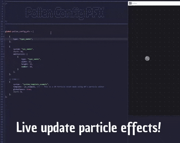 TLDR: I've always found GameMaker's particle API very clunky to use, especially for larger projects since it requires more boilerplate & lacks native live-update (i.e. 'hot-reload') capabilities. So I figured it would be nice to have a free library out there that’s easy to figure out and gives you different options for creating particle effects and organizing your PFX code. That's what I aim to do with Pollen.