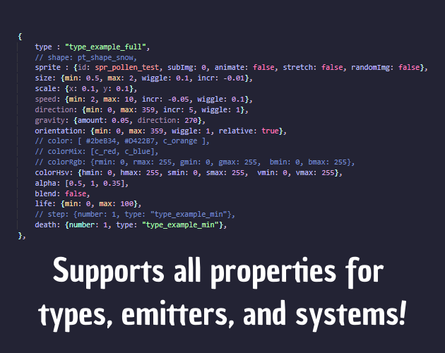 - Supports all of GameMaker’s built-in properties for Types, Emitters, & Systems, + more!